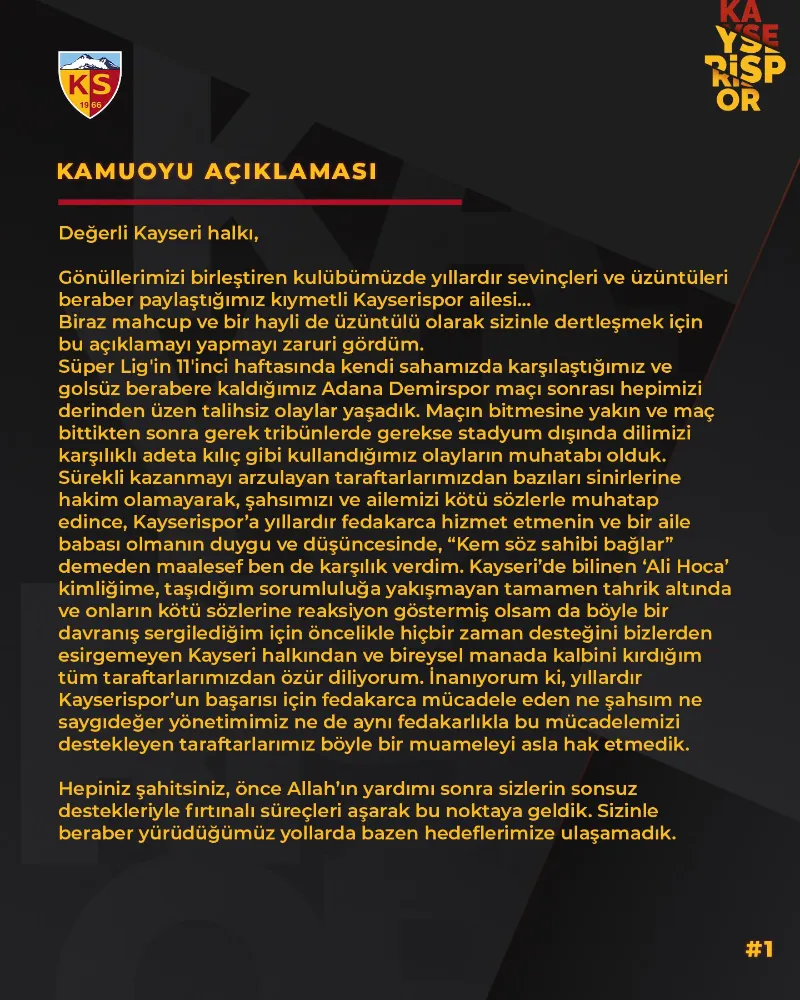 "Taşıdığım sorumluluğa yakışmayan, tamamen tahrik altında ve onların kötü sözlerine reaksiyon göstermiş olsam da böyle bir davranış sergilediğim için öncelikle hiçbir zaman desteğini bizlerden esirgemeyen Kayseri halkından ve bireysel manada kalbini kırdığım tüm taraftarlarımızdan özür diliyorum. İnanıyorum ki yıllardır Kayserispor'un başarısı için fedakarca mücadele eden ne şahsım ne saygı değer yönetimimiz ne de aynı fedakarlıkla bu mücadelemizi destekleyen taraftarlarımız böyle bir muameleyi asla hak etmedik. Hepiniz şahitsiniz, önce Allah'ın yardımı sonra sizlerin sonsuz destekleriyle fırtınalı süreçleri aşarak bu noktaya geldik. Sizinle beraber yürüdüğümüz yollarda bazen hedeflerimize ulaşamadık. Sizler nasıl üzüldüyseniz bizler de o duyguların en yoğun halini yaşadık."
