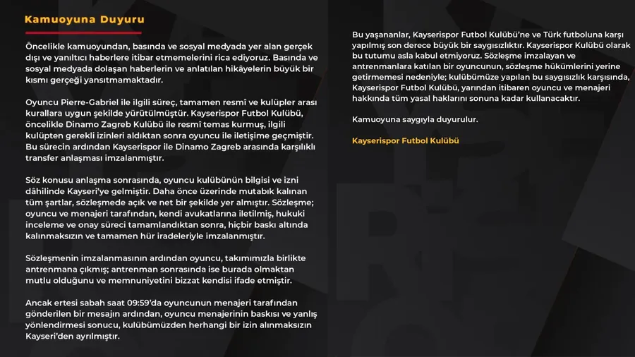 Açıklamanın devamında, Pierre-Gabriel’in kulübünün bilgisi ve izni dahilinde Kayseri’ye geldiği vurgulandı. Taraflar arasında önceden mutabık kalınan tüm şartların sözleşmede yer aldığı, sözleşmenin oyuncu ve menajeri tarafından avukatlara iletilerek hukuki incelemeden sonra özgür iradeyle imzalandığı kaydedildi.