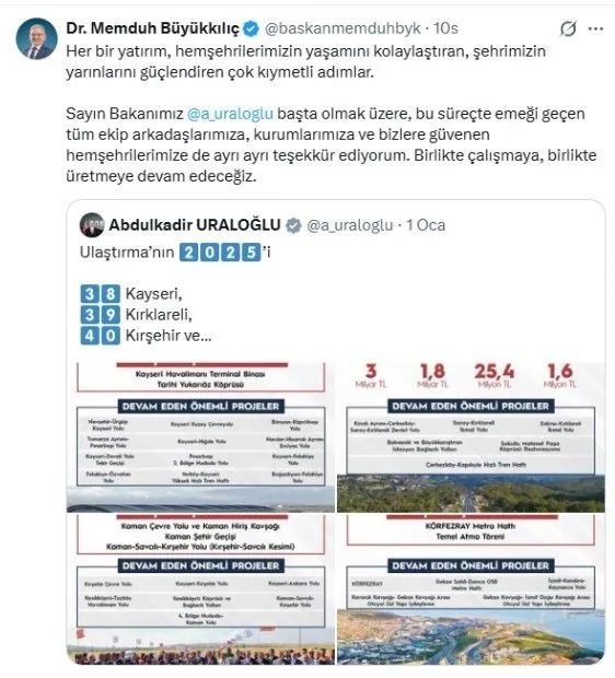Kayseri Büyükşehir Belediye Başkanı Dr. Memduh Büyükkılıç, Ulaştırma ve Altyapı Bakanlığı’nın 2025 yılı içerisinde Kayseri’ye kazandırdığı 6,6 milyar TL’lik yatırımlara ilişkin değerlendirmede bulundu. Başkan Büyükkılıç, sosyal medya hesabından yaptığı paylaşımda, söz konusu yatırımların kentin ulaşım ve altyapı geleceği açısından büyük önem taşıdığını vurguladı.