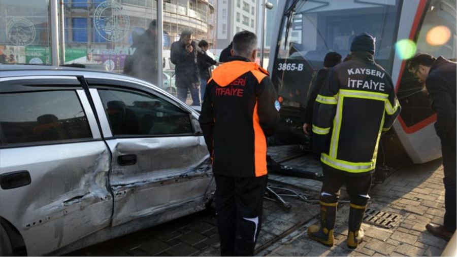 Kayseri’de kazaya karışan otomobil, yoldan çıkarak tramvay yoluna girdi. Otomobilin durakta bekleyen vatandaşlara çarpmasını da, tramvay engelledi.
