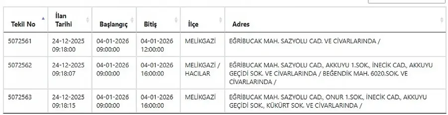 KCETAŞ’tan edinilen bilgilere göre, 4 Ocak 2026 Pazar günü Kayseri’de planlı elektrik kesintisi uygulanacak ilçe ve mahalleler şu şekilde olacak: