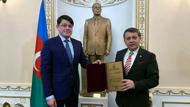 Eyvazlı ve Tattersall, Muradov'a KGK anı şildi ve Küresel Medya Dergisi takdim ettiler.