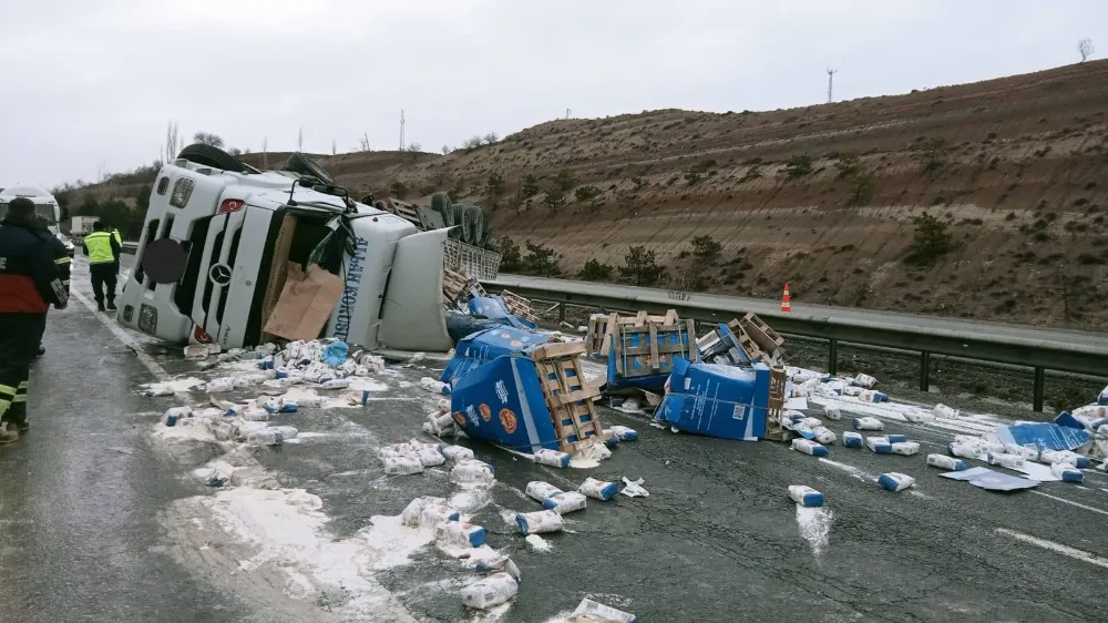 A.K'nin (52) kullandığı plakası öğrenilemeyen un yüklü tır, Kırıkkale-Samsun kara yolu Büyük Yağlı köyü mevkisinde yola devrildi.