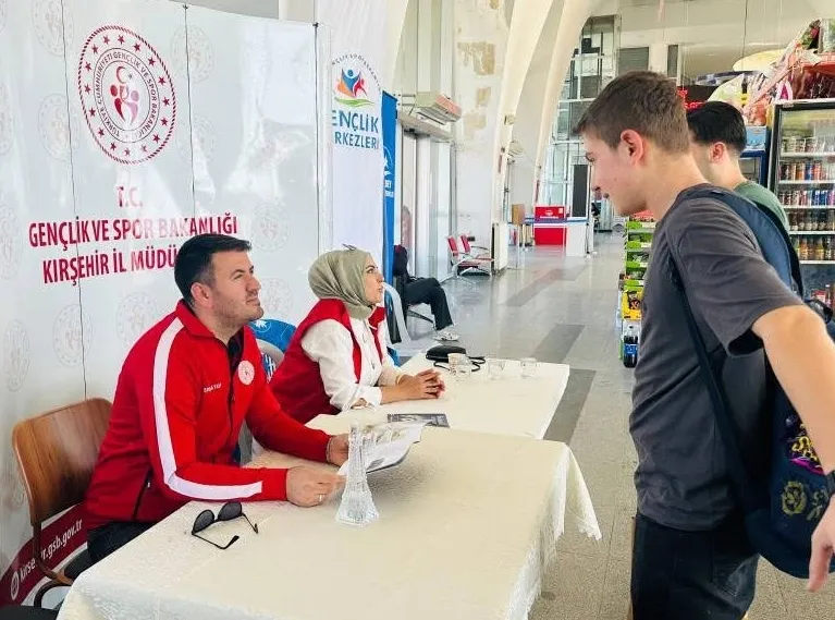 Kırşehir Şehirlerarası Otobüs Terminali'nde açılan stantlarda üniversite eğitimi için kente ilk kez gelen misafirleri bilgilendiren görevliler, kalacakları yurtlarla ilgili bilgi veriyor.