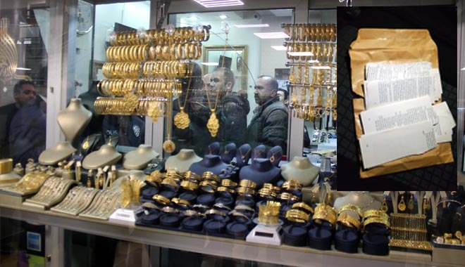 Kayseri´de, kitap sayfalarını para gibi kesip sarı zarfa koyduktan sonra kuyumcu soymak isteyen 1 kişi, 40 bin TL´lik bilezikleri alıp kaçarken çevre esnafı tarafından yakalandı.
