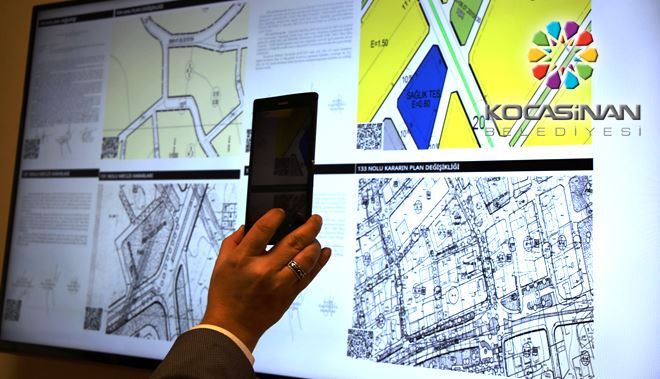 Plan ve Proje Müdürlüğü bünyesinde askıya asılması, ilan edilmesi gereken evraklar dijital ortamda büyük ekranlara yansıtılmaktadır. Her evrakın altında kendisine ait bir karekod bulunuyor. Mobil uygulamalardan bu karekodlar okutularak söz konusu evrak cep telefonları yada tabletlere indirilebiliyor. Evrakları kaydedip daha sonra inceleme veya başka bir ortama aktarma imkanı da sağlanmaktadır. Bunun için barkodu okutmak yeterli oluyor.