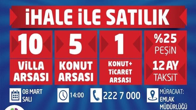 Ertuğrulgazi Mahallesi’nde 10 adet villa arsası, Beyazşehir Mahallesi’nde 3 adet konut alanı, Kayabaşı Mahallesi’nde 1 adet konut alanı, Mithatpaşa Mahallesi’nde 1 adet konut alanı ile 1 adet ticaret ve konut arsası olmak üzere toplam 16 taşınmaz satılacak. 8 Mart Salı Günü saat 14.00'de başlayacak olan ihaleye katılmak isteyenler; ihalelerle ilgili şartname ve ekleri Emlak Müdürlüğü'nden temin edinilebileceği, ayrıca 0(352) 222 70 00 numaralı telefondan ayrıntılı bilgi alınabileceği kaydedildi.