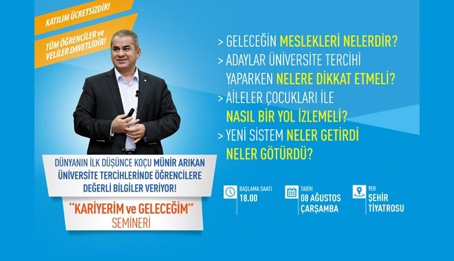 Geleceğin Meslekleri Nelerdir? Adaylar üniversite tercihlerini yaparken nelere dikkat etmeli? Aileler çocukları ile nasıl bir yol izlemeli? Yeni sistem neler getirdi, neler götürdü? Tüm bu sorular, düzenlenecek olan seminerde cevap bulacak. Gençlerin daha sağlıklı kariyer planlaması yapabilmesi amacıyla düzenlenecek olan ?Kariyerim ve Geleceğim´ konulu seminere konuşmacı olarak katılacak olan Düşünce Koçu Münir Arıkan, kendine has üslubuyla deneyimlerini öğrencilerle paylaşacak. Seminer, 8 Ağustos Çarşamba Günü Saat 18:00´de Şehir Tiyatrosun ´da gerçekleştirilecek.