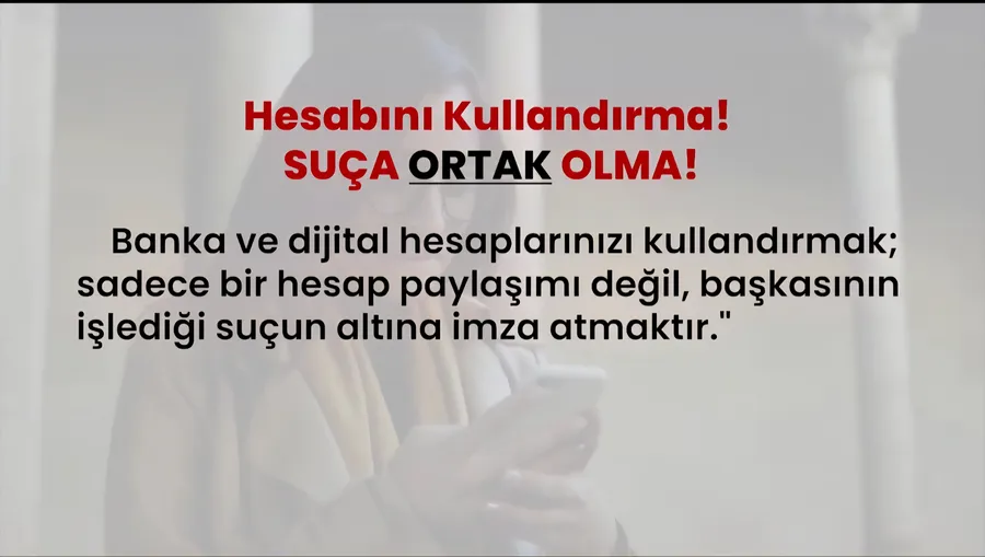 Emniyet Genel Müdürlüğü ile Adalet Bakanlığı, banka hesabı kiralama ve benzeri işlemlerin ciddi riskler barındırdığına dikkat çekmek amacıyla ortak bir bilgilendirme videosu hazırladı. Hazırlanan içerik, kamu kurum ve kuruluşlarının sosyal medya hesapları üzerinden kamuoyuyla paylaşıldı.