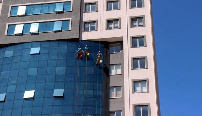 Kentte dev binaların dış cephe temizliğini yapan işçiler, herkesin bakmaya bile cesaret edemediği yükseklikte komando gibi teçhizatlanarak ip yardımıyla işlerini yapıyor. Güvenlik önlemlerini alarak işe koyulan işçiler, daha sonra aşağıya sarkıttıkları halattan tutunarak yanlarına aldıkları bez ve su dolu kovayla alın teri döküyor. 7 kişilik ekibiyle Kayseri´de yüksek binaların temizliğini yapan işveren İsa Bal, "Burada endüstriyel dağcılık eğitimi ile cam temizliği yapıyoruz. Aynı zamanda Kayseri´ye bir yeni bir sistem getirdik, asma iskele ile boya sistemi. İskele kurmadan kolay bir şekilde dış cephe boya işlemleri yapıyoruz. Kayseri´ye 4 yıldır ip ile hizmet veriyoruz. 7 kişilik bir ekibimiz var. Gayet kolay, hızlı ve güvenli bir şekilde çalışmalarımızı yapıyoruz. Hazırlık kısmında emniyetimizi aldıktan sonra en güvenli yerleri tespit ediyoruz ve ardından iplerimizi bağlıyoruz ardından arkadaşlarımızı birer birer sallıyoruz. Risk faktörlerine gelecek olursak yolda dururken bir araba takla atıp bize çarpabilir, böyle bir risk binde birdir. Bizim çalışmalarımızdaki risk bundan daha az. Bu işi yapan arkadaşlarımız yüksekte çalışabilir eğitimini tamamladıktan sonra belgelerini alıyorlar, risk analiz raporlarını ve sigorta bildirilerini işverene teslim ediyoruz. O şekilde iş başı yapıyorlar" dedi.