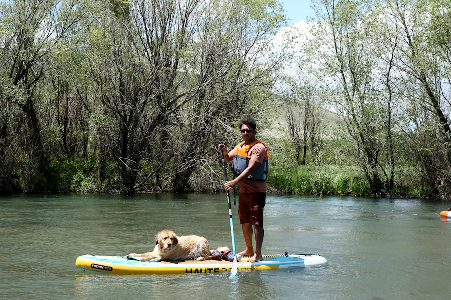 Henüz 3 aylıkken sahiplendiği "Ateş Bey"i 8 yıldır yanından ayırmayan Mehmet Ağca, gittiği her yere ve aktiviteye köpeğini de götürüyor. Ağca, kano ve kürek sörfü olarak da bilinen SUP (Stand Up Paddle) sporunu da köpeğiyle yapıyor.
