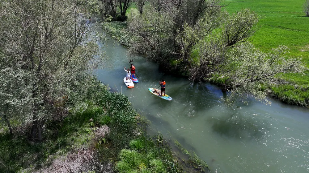 Kayseri'nin Tomarza ilçesinden geçen Zamantı Irmağı'nda düzenlenen "SUP Festivali"ne de "Ateş Bey" ile katılan Ağca, doğanın güzelliklerine kuş cıvıltıları eşliğinde köpeğiyle şahitlik ediyor.