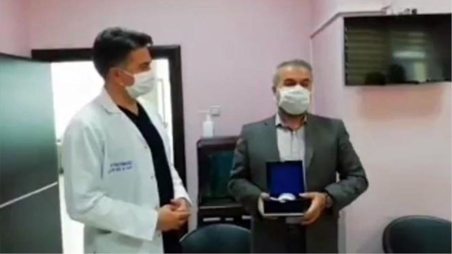 ERÜ Hastaneler Başhekim Yardımcısı Prof. Dr. Musa Karakürkçü de, immün plazma bağışında bulunan Prof. Dr. İsmail Kayar’a Erciyes Üniversitesi Hastaneleri’nin logolu kupasını hediye etti.