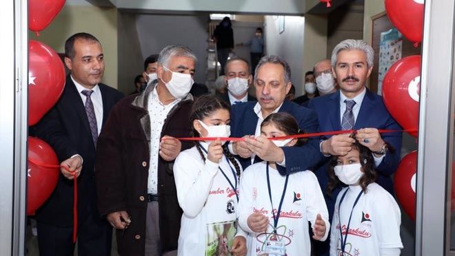 Kayseri'nin Talas ilçesinde bulunan Kamber Ortaokulu'nda TÜBİTAK 4006 Bilim Fuarı Açılışı gerçekleştirildi.