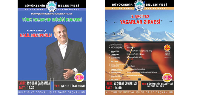 Bu hafta tiyatroseverler için ise iki ayrı oyun sahnelenecek. Büyükler 21 Şubat Cuma günü saat 19.30`da Şehir Tiyatrosu`nda "Yeşil Papağan Limited" adlı oyunu, çocuklar ise 23 Şubat Pazar günü saat 13.00`de "Ali Baba ve Kırk Haremiler"i seyredebilecek. Bu hafta ayrıca Erciyes Yazarlar Zirvesi yapılacak.