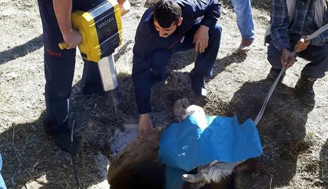 Edinilen bilgiye göre kuyuya düşen ineğin sesini duyan vatandaşlar itfaiye ekiplerine haber verdi. Yapılan ihbar sonrasında olay yerine gelen itfaiye ekipleri, betan kırma makinesi ile ineğin düştüğü kuyunun girişini genişletti. Kırma çalışmaları sırasında ineğin ürkmemesi için gözü kapatıldı.