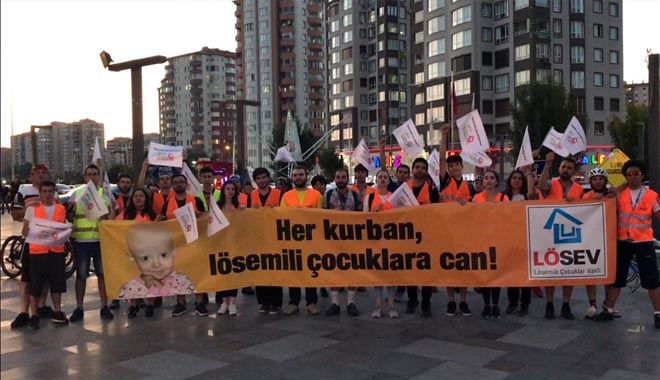 Kurban bağışlarının önemine dikkat çekmek isteyen ?Perşembe Akşamı Bisikletçileri? pedallarını LÖSEV için çevirdiler. Giydikleri LÖSEV yelekleri ile renkli görüntüler oluşturan gönüllüler, ?Lösemili çocuklar için buradayız, onların daha iyi beslenme koşullarına ulaşabilmeleri için pedallarımızı çeviriyoruz? ifadesini kullanırken, LÖSEV Kayseri İl Koordinatörü Ayşegül ÇİFTÇİ yaptığı açıklamada, ?LÖSEV´e kayıtlı ve kısıtlı imkânlar içinde tedavilerine devam eden onko hastaları ve ailelerine 12 ay boyunca taze et ve et ürünleri ulaştırıyoruz. Kayserili hayırseverlerimizin desteklerini bekliyoruz. Bu yıl Vekâleten Kurban bedelimiz 1040 TL olarak belirlendi. Vekâleten Kurban kesimi yapmayan bağışçılar da LÖSEV Kurban Bayramı bağışı yaparak, çocuklarımızın ücretsiz tedavi, eğitim ve sosyal alandaki ihtiyaçlarının karşılanması için destek olabilirler. Bağışçılar bağışlarını ofisimizi ziyaret ederek, www.losev.org.tr internet sitesi üzerinden, tüm Banka şubelerinden gerçekleştirebilirler. Bugün burada çocuklarımız için bulunan ?Perşembe Akşamı Bisikletçileri´ne destekleri için teşekkür ederiz? şeklinde konuştu?
