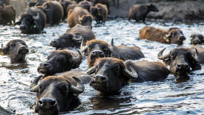 Sulak alanda yüzen mandalar, günün yorgunluğunu burada atıyor, temizleniyor.