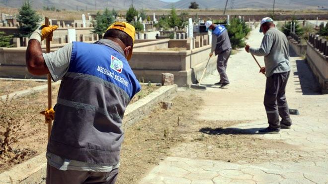 Melikgazi Belediyesi ekiplerince temizlenerek, daha güzel bir görünüme kavuşturulan mezarlıkları Kurban Bayramı'na hazırlayan belediye ekipleri, mezarlıklarda kuruyan otlar, dikenler, atılan çöp ve katı atıkları temizlendi.