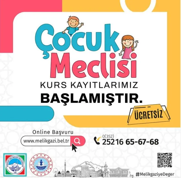 Melikgazi Belediyesinin 7-14 yaş arası çocuklar için ücretsiz olarak düzenlediği "Çocuk Meclisi" kurs kayıtları başladı.