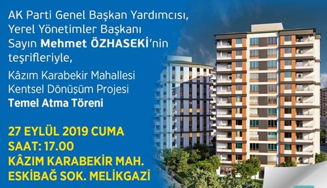 Melikgazi Belediye Başkanı Dr. Mustafa Palancıoğlu, kentsel dönüşüm projesi kapsamında Kazım Karabekir Mahallesi´nde 2 blok halinde 9 dükkân ve 99 dairelik konutların; AK Parti Genel Başkan Yardımcısı, Yerel Yönetimler Başkanı Mehmet Özhaseki´nin katılımı ile 27 Eylül 2019 Cuma günü (bugün) saat 17.00´de düzenlenecek tören ile temelinin atılacağını söyledi.