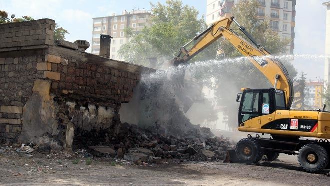 Melikgazi Belediyesi sınırları içerisindeki tehlike arz eden metruk binalar belediye ekiplerince yıkılıyor.