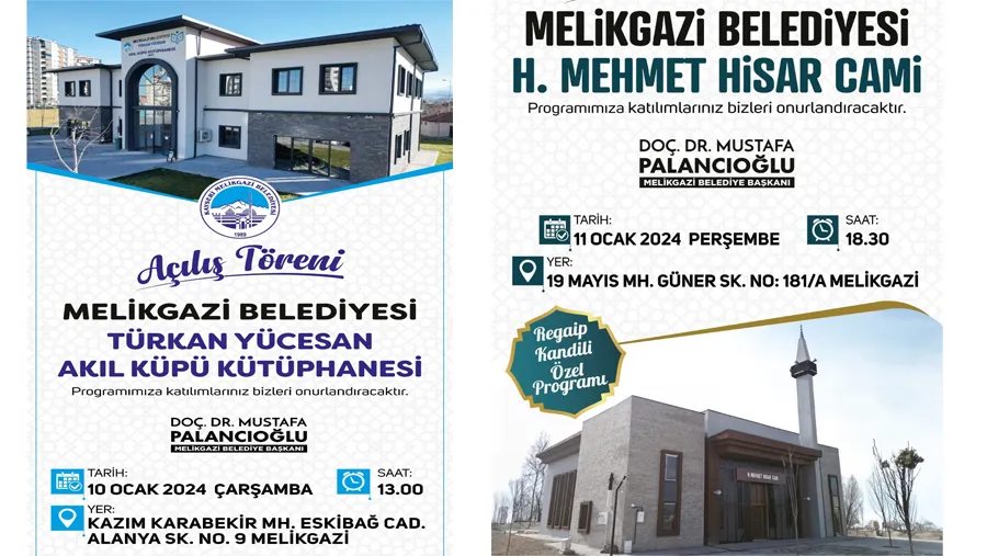 "19 Mayıs Mahallesi’nde Melikgazi Belediyemiz ve Hayırsever Mehmet Hisar ile birlikte yapımını tamamladığımız H. Mehmet Hisar Cami’mizi Regaip Kandili'nde ibadete açıyoruz. Dolayısıyla burada ihtiyaç olan ibadethaneyi de hizmete kazandırmış olduk. Tüm hemşehrilerimizi açılışlarımıza bekleriz."