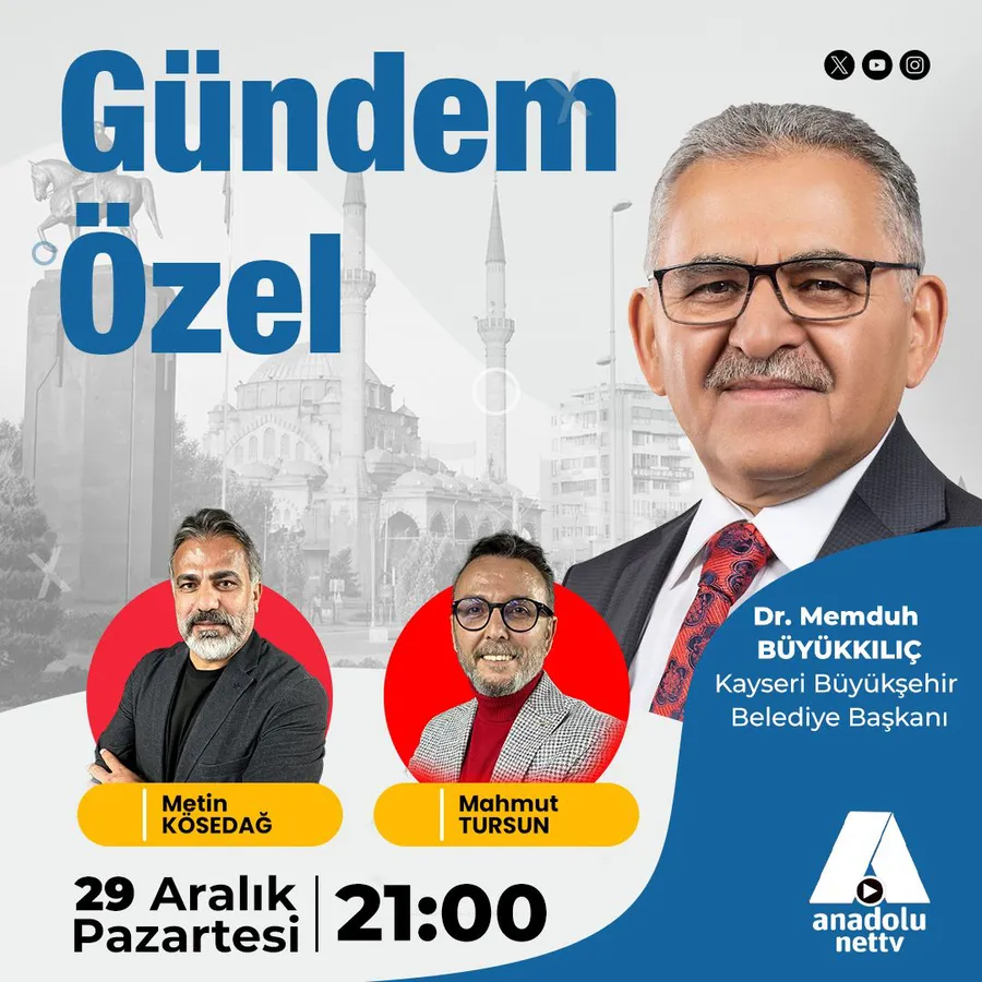 Kayseri Büyükşehir Belediye Başkanı Dr. Memduh Büyükkılıç, Anadolu Net TV’de yayınlanan Gündem Özel programının konuğu olacak. Detaylar Kayseri Haber'de...