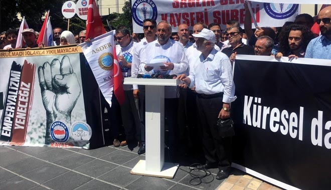 Cumhuriyet Meydanı´nda gerçekleştirilen protesto eyleminde katılımcılar adına basın açıklması yapan Memur- Sen Kayseri Temsilcisi Aydın Kalkan ABD Başkanı Trump´ın Türk ekonomisini hedef alarak çeşitli uygulamaları devreye sokarak zor duruma düşürmek istediğini ama Türk milletinin bu ekonomik sıkıntıdan da milli birlik ve beraberlikle çıkabileceğini vurgulayıp,Türk milletinin hile ve tuzakları ferasitiyle ve Allah´ın yardımıyla boşa çıkardığını kaydederek ?2013 yılından beri sistematik uygulanan devletimizi ve milletimizi yıkmak için uygulanan müdahalelerin bir yenisi ile karşı karşıyayız. Birliğimize, bağımsızlığımıza, değerlerimize kast eden bu girişimler ne ilktir ne de son olacaktır. Gezi olayları, 17-25 Aralık Kumpası, kitlesel terör saldırıları, çukur eylemleri, 15 Temmuz kanlı darbe girişimi ve ülkemizin güneyinde terör koridorunun oluşturulmak istenmesi, birilerinin Türkiye ile ilgili durmaksızın düşmanlık planladığını göstermektedir. Bu aziz millet tüm hile ve tuzakları ferasetiyle ve Allah´ın yardımıyla boşa çıkarmıştır. Karanlık bir odak bu sefer yüzünü bile gizlemeden alenen Türkiye´yi ekonomik anlamda köşeye sıkıştıracak eylemlere girişmiştir. ABD Başkanı Trump, Türk ekonomisini hedef alarak çeşitli uygulamaları devreye sokmuştur? değerlendirmesinde bulundu?
