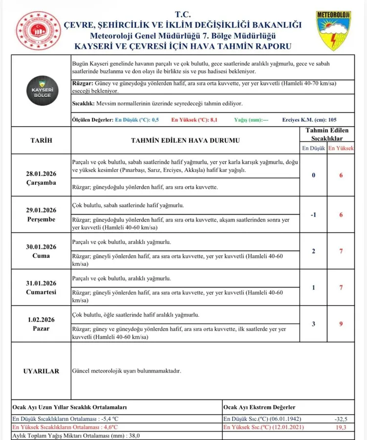 Meteoroloji 7. Bölge Müdürlüğü’nün yayımladığı hava tahmin raporuna göre, Kayseri genelinde gece saatlerinden itibaren yağmur, yüksek kesimlerde ise karla karışık yağmur görülecek. Özellikle Sarız, Erciyes, Akkışla ve Pınarbaşı çevrelerinde çarşamba günü hafif yağışların etkili olması bekleniyor.