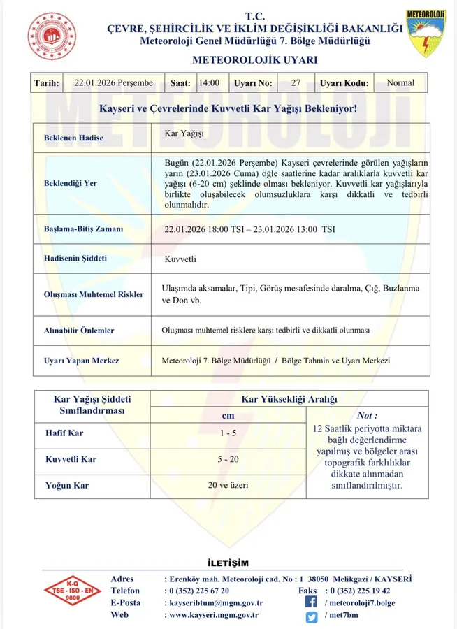 Meteoroloji Genel Müdürlüğü 7. Bölge Müdürlüğü tarafından yayımlanan uyarıya göre, Kayseri ve çevrelerinde kuvvetli kar yağışı bekleniyor.