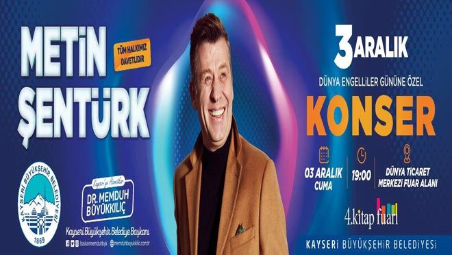 Engelli ve kitap dostu Büyükşehir Belediyesi, 3 Aralık Dünya Engelliler Günü’nde açılışı gerçekleşecek 4. Kitap Fuarı’nda anlamlı bir etkinliğe imza atıyor. Sanatçı Metin Şentürk, özel günde özel bir konserle Kayserili hayranları ile bir araya gelecek.