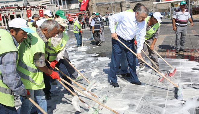 Büyükşehir Belediyesi tarafından yapılan çalışmalarla Cumhuriyet Meydanı sabunlu suyla yıkanarak temizlendi. Temizlik çalışmalarına Büyükşehir Belediye Başkanı Mustafa Çelik bizzat katıldı. Başkan Çelik, temizlik sonrası kaldırım ve yeşil doku çalışmalarının başlayacağını belirtti ve meydanın Kayseri´ye yakışır hale getirileceğini söyledi.