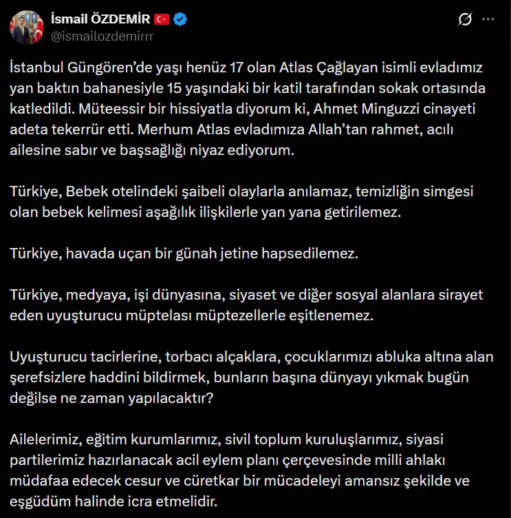MHP Genel Başkan Yardımcısı ve Kayseri Milletvekili İsmail Özdemir, İstanbul’un Güngören ilçesinde 17 yaşındaki Atlas Çağlayan’ın hayatını kaybettiği cinayetle ilgili sosyal medya hesabından dikkat çeken bir paylaşım yaptı.