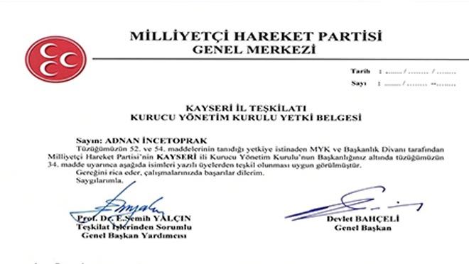 Milliyetçi Hareket Partisi Kayseri İl Başkanlığı görevine atanan Adnan İncetoprak'ın oluşturduğu il yönetim kurulu MHP Genel Merkezi tarafından onaylandı.