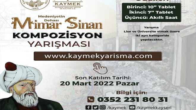 Türk-İslâm medeniyetine mimari alanında büyük hizmetleri bulunan ve eserleri asırlar geçmesine rağmen günümüzde dahi hizmet veren Mimar Sinan’ın, gerek Kayseri gerek Türkiye gerekse bütün dünya için büyük bir değer olduğunu kaydeden Büyükkılıç, “Başvuruları devam eden lise ve üniversite olmak üzere iki ayrı kategoride yapılacak yarışmaya katılım için kaleme alınacak kompozisyona, Mimar Sinan, Mimar Sinan’ın eserleri, düşünce dünyası, insanlığa ve medeniyetimize bıraktığı silinmez izler, maddi ve manevi mirası gibi konulardan herhangi biri veya birkaçı konu olabilecek. Yarışmada birincilik derecesi için 10 inç tablet, ikincilik derecesi için 7 inç tablet ve üçüncülük derecesi için akıllı saat ödülleri takdim edilecek”