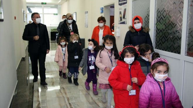 Minik öğrencilerin ziyareti, hatıra fotoğrafıyla son buldu.