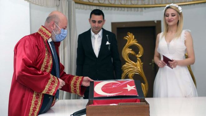 Çolakbayrakdar, törenin ardından evlilik cüzdanını çifte verirken, Türk Bayrağı, Kur’an-ı Kerim ve Aile İlmihali hediye ederek çifte ömür boyu mutluluklar diledi.