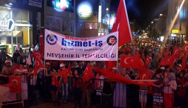 Hak-İş Konfederasyonuna Bağlı Hizmet-İş Sendikası, Öz Büro İş ve Öz İş Sendikası üyesi yüzlerce kişi 15 Temmuz darbe girişimini protesto ederek yürüyüş gerçekleştirdi.