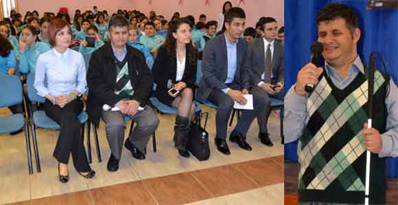 Erciyes Kolejinde düzenlenen programa, ‘Ülkem İçin’ Kayseri elçisi Ahmet Başkal, Psikolog Ceren Kurtay, görme engelli Adem Vural, Sosyolog Buket Demirel katıldı. Programda açılış konuşmasını yapan ‘Ülkem İçin’ Kayseri elçisi Ahmet Başkal, “Devlet Planlama Teşkilatı ve Devlet İstatistik Enstitüsü tarafından açıklanan veriler göre ülke nüfusunun yüzde 12,29’u engellidir. Bu oran son nüfus sayımına göre 8,5 milyon kişiye karşılık gelmektedir. Günlük yaşantımızda cadde ve sokaklarda çok sayıda engelli kişi ile karşılaşmamızın neden, engelli kişilerin mevcut olmaması değil, bu kişilerin dış mekanlardan yardım almadan faydalanabilmelerinin çoğu durumda olanaksız olmasıdır” diye konuştu.