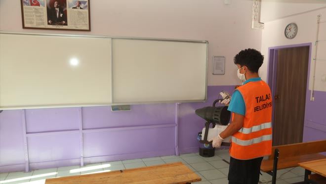 21 Eylül Pazartesi günü başlayacak olan yüz yüze eğitim öncesi Talas’taki okullarda dezenfekte ve hijyen çalışması yapılarak eğitim-öğretime hazır hale getirildi.
