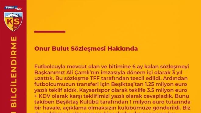 Sarı-kırmızılı ekibin 'haksız fesih' yapıldığı gerekçesiyle TFF Uyuşmazlık Çözüm Kurulu'na taşıdığı konu hakkında Kayserispor bir açıklama yayınladı. Yapılan açıklamada, Onur Bulut’un sözleşmesinde herhangi bir çıkış maddesi bulunmadığını belirtilerek “Futbolcu ile olan ve bitimine 6 ay kalan sözleşmeyi dönem içi olarak 3 yıl uzattık. Bu sözleşme TFF'ye tescil edildi. Ardından Beşiktaş’tan 1.25 milyon Euro yazılı teklif aldık. Bizde 3.5 milyon Euro + KDV karşı teklife yazılı olarak cevap verdik. Bunu takiben de Beşiktaş kulübü 1 milyon Euro tutarında açıklaması olmayan bir havale gönderdi. Biz de sebebe dayanmayan bu ödemeyi Beşiktaş’a iade ettik. Aynı aksam sosyal medyada futbolcunun Beşiktaş’a imza attığı açıklandı. Ertesi gün dekonta açıklama yazılarak para bize tekrar gönderildi. Beşiktaş’a ihtarname çekerek 3.5 milyon Euro artı KDV isteğimizi yeniledik. TFF'nin tescil ettiği sözleşmede futbolcunun çıkış hakkının olmadığını bildirdik. Kulübümüz ile Onur Bulut arasında çıkış hakkı konusunda düzenleme ihtiva eden bir protokolde bulunmamaktadır. Konu artık hukuki zeminde tartışılmaktadır. Deprem şuan birinci önceliğimiz. Hayat normalleşmeye başladığı anda Beşiktaş’a gereken cevabı vereceğiz” dedi.