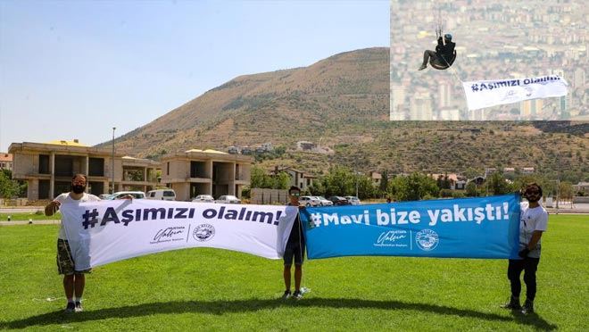 Talas Belediye Başkanı Mustafa Yalçın, aşı konusunda yürüttüğü önemli çalışmalara bir yenisini daha ekledi. Talas Belediye Başkanı Mustafa Yalçın imzalı iki pankartın birinde ‘Aşımızı olalım’ çağrısı yapılırken bir diğerinde de mavi kategoriye yükselen Kayseri’den dolayı ‘Mavi Bize Yakıştı’ sloganı yer aldı. Paraşütlerinin altına bağladıkları “Aşımızı olalım” ve “Mavi bize yakıştı” yazılı pankartlarla Ali Dağı’nın zirvesinden havalanan pilotlar, ilçe üzerinde tur atarak farkındalık oluşturdu.