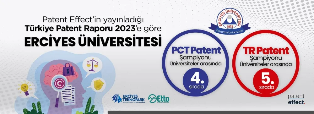 PatentEffect tarafından 'Türkiye'nin Patent Raporu 2023’ verileri açıklandı. Açıklanan verilere göre, Türkiye (TR) Patent Tescil Şampiyonu Üniversiteleri sıralamasında Erciyes Üniversitesi (ERÜ) 4. sırada yer aldı.