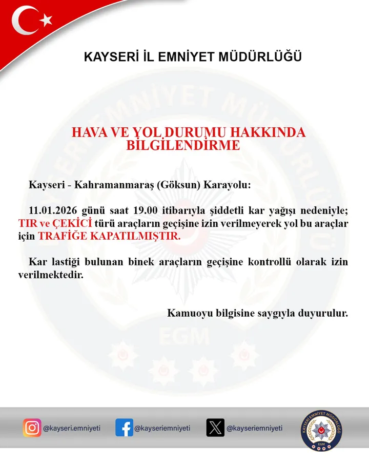 Kayseri’de etkili olan kar yağışı nedeniyle Pınarbaşı–Kahramanmaraş (Göksun) karayolu, TIR ve çekici türü araçların geçişine kapatıldı. Detaylar Kayseri Haber'de...
