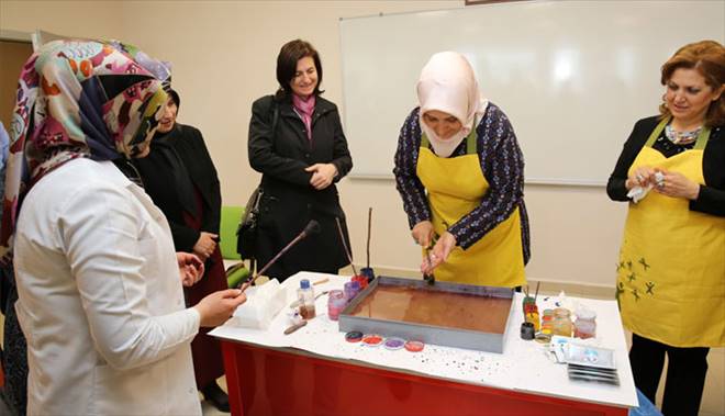 Kocasinan Belediye Başkanı Ahmet Çolakbayrakdar`ın eşi Fatma Çolakbayrakdar ve AK Parti İl Kadın Kolları Başkanı Sevilay İlkentapar`ın da katılımıyla TOKİ Gençlik Merkezi`nde gerçekleştirilen programın ardından tesisi gezen protokol eşleri, ebru yaparak bu alandaki yeteneklerini ortaya koydu.
