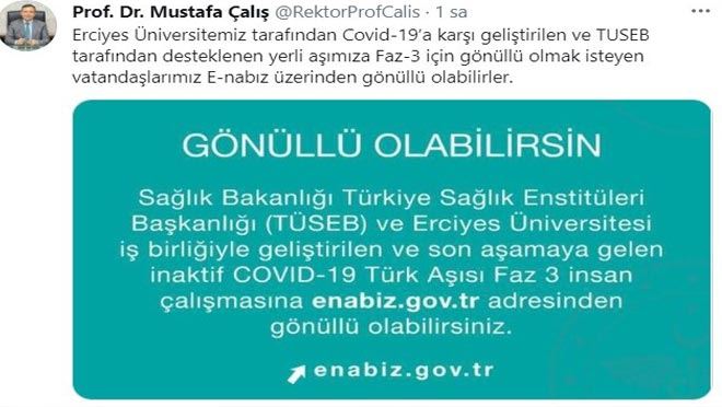 Erciyes Üniversitesi REktörü Prof. Dr Mustafa Çalış, sosyal medya hesabından yaptığı duyuruda, "Erciyes Üniversitemiz tarafından Covid-19’a karşı geliştirilen ve TUSEB tarafından desteklenen yerli aşımıza Faz-3 için gönüllü olmak isteyen vatandaşlarımız E-nabız üzerinden gönüllü olabilirler" ifadesinde bulundu.