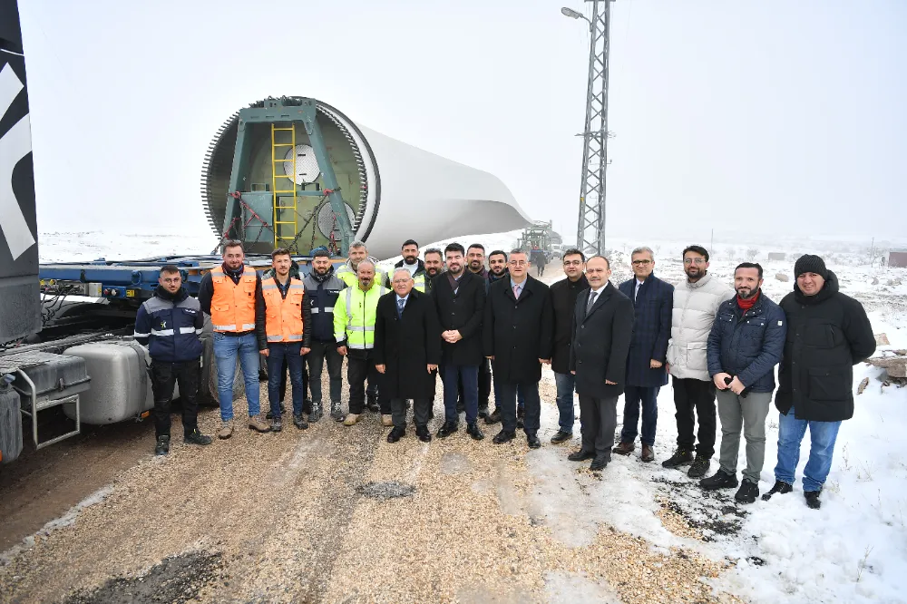 "21 megavat, yeni nesil ve dünyada kendisini kanıtlamış olan bir firmanın ürünü. Daha önce platformu hazırlandı, yollar test edildi, gerekli altyapı oluşturuldu. Yaklaşık 6 kilometrelik enerji nakil hattı organize sanayimizdeki indiriciye bağlanmış oldu. Bundan sonraki süreçte gelen kanatların ve türbinlerin montaj süreci var. Burada fedakarca çalışmaları görüyoruz. Şehrimize yakışır proje. Hizmetlerin en güzelini sunmak amacıyla Ulaşım AŞ'mizin enerji sorununu çözüp, ayrıca kazanım elde edecek. Ekibi, firmayı, bu güzel kardeşlerimizi ayrı ayrı tebrik ediyorum."