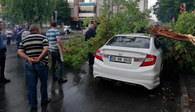 Kayseri´de dün etkili olan rüzgar dolayısıyla devrilen ağaç, otomobilin üstüne düştü.