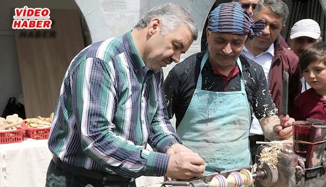 Hat sanatı standını ziyaret eden Başkan Çelik, daha sonra cam üfleme sanatını izledi ve ardından bu sanatı bizzat icra etti. İpek dokuma ve keçe dokuma sanatlarını takip ederek ustalarıyla sohbet eden Başkan Mustafa Çelik, mozaik sanatıyla yapılmış tabloları ilgiyle inceledi. Bıçak ve kılıç yapımı standında yer alan ürünleri inceleyen Başkan Çelik, daha sonra baston yapımı standına geçerek bir süre tezgahta çalıştı. Büyükşehir Belediye Başkanı Çelik, daha sonra da eskiden çocukların en önemli eğlencelerinden olan topaç yapımını yerinde gördü ve bizzat çalışarak bir topaç yaptı. Başkan Çelik, yapmış olduğu topacı daha sonra test ederek çevirdi.